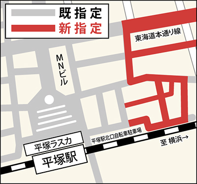 市は4月1日から、平塚駅周辺の自転車等放置禁止区域を拡大する。新たに指定される区間は、駅北口側の宮の前、宝町、老松町周辺。東海道本通り線、宝町通線を含む7路線、約1・5Kmが該当する。