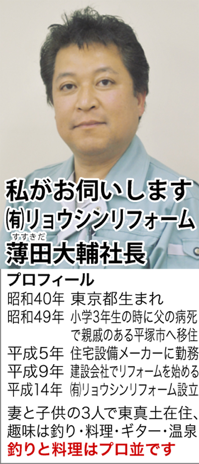 市内総合リフォーム会社の(有)リョウシンリフォーム(薄田(すすきだ)大輔社長)は小さな修理から大規模な増改築まで、住まい全般に精通した対応力が持ち味だ。リフォーム一筋18年の社長が打合わせから現場監督まで切れ目なく担当。腕の良い地元職人約50人を固定して起用し、質の高い工事を提供する。