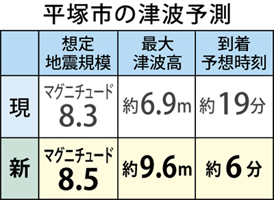 今回県が見直した結果では、元禄連動型地震の想定規模が拡大。マグニチュードは8・5に、断層位置なども、より大きな被害が想定される内容に変更された。平塚市の最大津波予想は9・6mで、到達時間は約6分後と大幅に短くなる予測を立てた。