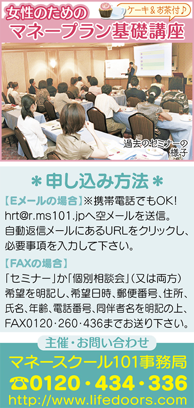 より詳しい相談を希望する方のための無料個別相談会は4月5日(日)〜16日(木)。「マネースクール101事務局」(中原2の16の6・Pあり)で10時〜20時。相談時間60分の要予約制。