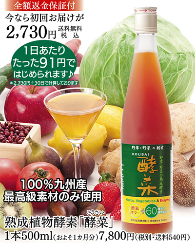 食生活の欧米化や農薬、防腐剤、合成着色料を含む食事により、不足がちな酵素をしっかり摂取するなら、熟成純植物酵素「酵菜(こうさい)」がおすすめ。「酵菜」は、九州産の厳選された最上級の素材のみを使用し、熟成させた60種の野草・野菜の一番しぼりだけを詰めた酵素ドリンク。ほんのり甘すっぱい味わいで、保存料・添加物・砂糖・香料を一切使用していないから、赤ちゃんも安心して飲むことができる。