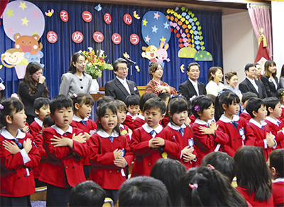 今年の卒園児は年長クラスの68人。お揃いの制服に袖を通した卒園児は「お父さん、お母さん、いままでありがとう」と感謝の言葉を述べた。我が子の成長した姿に嬉し涙を浮かべる保護者らの姿も見られた。