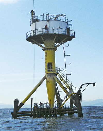 相模湾平塚沖から約1Kmの地点にある「平塚沖総合実験タワー」(タワーオフィサー・東京大学生産技術研究所林昌奎教授)。国内唯一の沖合海洋観測施設で、45年以上にわたり、海象・気象データを集積している。湾岸開発や海洋再生エネルギーなど先駆的な研究・実験を進める場として研究者らの注目を集めている。