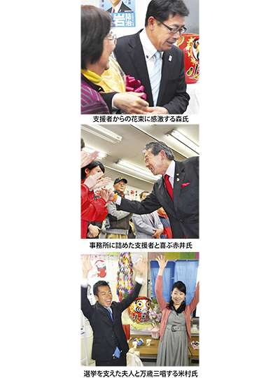 県議選の開票が行われた12日夜、森正明氏(自民)と赤井和憲氏(公明)、米村和彦氏(民主)の各陣営に当選確実の吉報が伝わると、それぞれの選挙事務所に詰めていた候補者と支援者が勝利に沸いた。