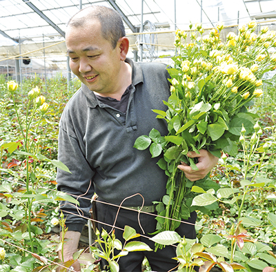 父親の代から続く「吉川ばら園」(城所459)の吉川浩一さん(46)も、ビニールハウス内で摘み取りを急ぐ。消費者の需要に応えようと多品種を扱い、ハウス内では色とりどりのバラが香りを放つ。この時期はハウス内の温度が30度を超えることもあるといい、収穫は体力勝負だ。