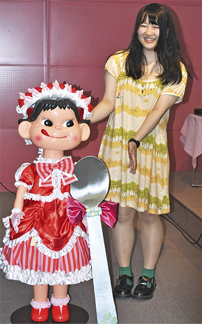 大賞を射止めたのは、同学園ファッションデザイン学科の4年生、島川香織さん(23)=東京都世田谷区在住。「甘いお菓子のイメージで甘い甘いペコちゃんにした」と話し、イチゴとクリームを頭に冠し、可愛らしいワンピースを着せた。