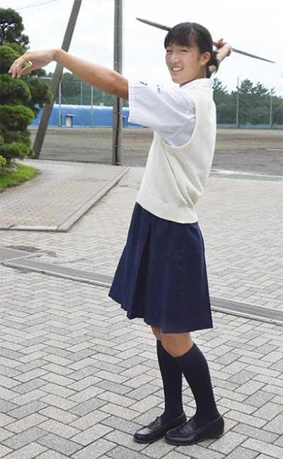 上野さんの武器は、すらりとした172cmの体。鞭のようにしなる手足と、江陽中学校のソフトボール部で鍛えた肩で記録を伸ばしてきた。