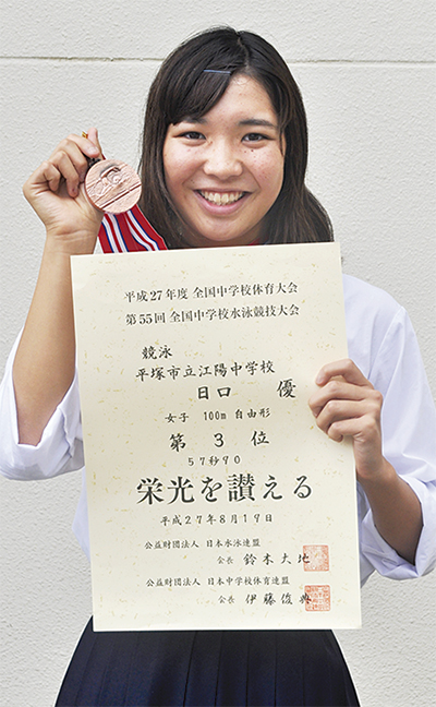 第55回全国中学校水泳競技大会(8月17日〜19日、秋田県立総合プール)で、江陽中学校3年の日口(ひぐち)優さんが女子100m自由形に出場し、3位に輝いた。