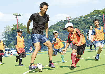 平塚市土屋のコロナ湘南平塚で、8月23日、プロサッカーの鹿糠幸司選手を招いたスペシャルイベントが行われ、コロナに所属する小学生約40人が参加した。