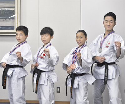 市役所を訪れたのは10歳男子形で3位の橋本基君(松原小4年)、10歳男子組手で3位の佐竹隼君(松原小4年)、11歳女子形と組手の部で3位の栁田亜衣さん(大野小5年)、15歳男子形で2位の松本拓己君(大野中3年)。4人は県大会や全国大会など、過去2年間の実績から選ばれ、推薦を受けて同大会に出場した。