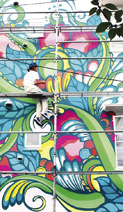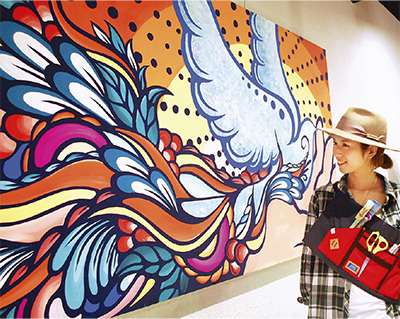 生きいきと波を打つ鮮やかな植物が一面に描かれた壁画―――。作者は平塚市上平塚出身のペインター・小野留依聖(ルイーゼ)さん(25)。店舗の壁画や企業プロモーションを手掛けるほか、国内外の野外フェスや芸術祭などでライブペイントを披露している。8月にはディズニー系列のBSチャンネルDlife(ディーライフ)のバラエティ番組「ラジオな2人」で芸人・ピースと共演するなど注目を集めている。