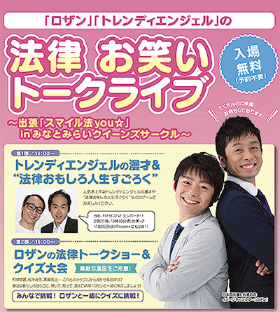 午後2時からは「トレンディエンジェルの漫才&法律おもしろ人生すごろく」、3時からは「ロザンの法律トークショー&クイズ大会」。午前10時から午後1時までは、司法書士による無料法律相談会(先着30人)も同開催。このイベントは神奈川県司法書士会が主催するもので、FMヨコハマで放送中の同会番組「スマイル法you☆」の出張版。(問)同会【電話】045・641・1372