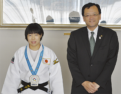 南原在住の五十嵐莉子さん(16)=横須賀学院高校1年=が、10月23日〜27日にアラブ首長国連邦(UAE)の首都・アブダビで開催された「世界ジュニア柔道選手権大会」に日本代表として出場し、女子44kg級(参加13カ国、16選手)で準優勝に輝いた。17日、落合克宏市長を表敬訪問した。