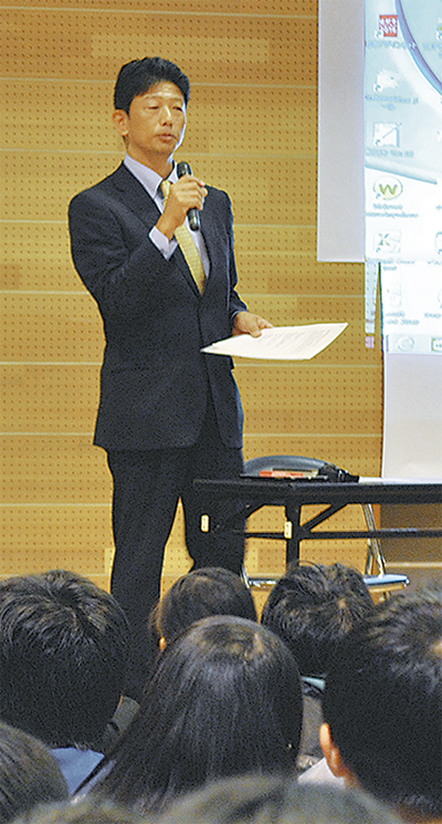 花水小学校で13日、甲子園で活躍した同小OB、志村亮さんを招いた「巣立ち講演会」が開かれた。来春に中学生になる6年生のため、PTAが主催した。