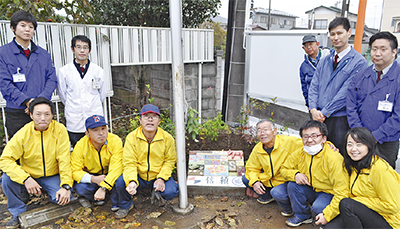 しまむら各店で清掃活動などにあたる4人の学園利用者らが、ナンテンやクチナシ、ヒイラギなどの植物を植えた。緑地帯の中央には、学園利用者が陶板に描いた絵を組み合わせたプレートを設置した。