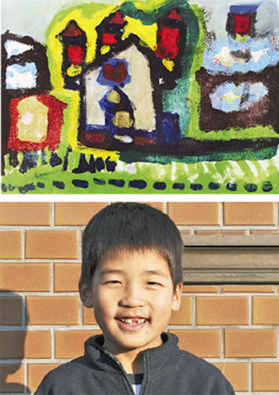 高橋君が描いたのは「未来の家はお城」。赤、青、金など、好きな色を用い、大きな城を描いた。「お城の煙突の部分を描くのが難しかったけど、一番気に入っている」と本人も満足気の様子だ。