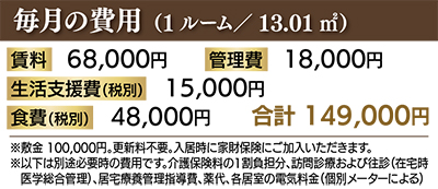 施設のポイントは大きく3つ。要介護・要支援認定を受けている方が自分らしい生活スタイルで自由に暮らせるよう、「住まい」「医療」「介護」に徹底して力を入れている。住まいについては、「高級感」と「安らぎ」にこだわった完全個室で利用者を出迎える。介護資格を持つ経験あるスタッフが常駐するなか、プライバシー厳守で認知症の方も安心して入居できる。