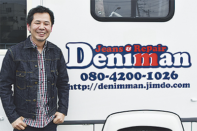 真っ白なキャンピングカーの側面に、「Denimman」と書かれた大きなロゴ。ドアを開ければ「デニムマン」張本人、新倉健一郎さん(50)が迎えてくれる。