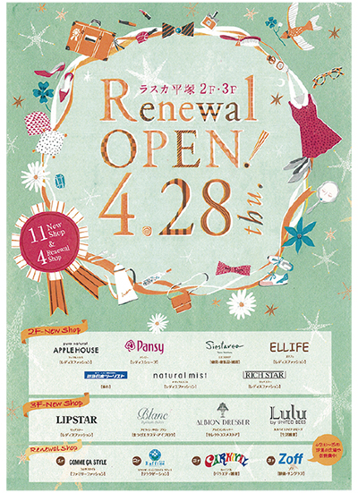 JR東海道線「平塚駅」に直結する商業施設「ラスカ平塚」が今日4月28日(木)午前10時、リニューアルオープンする。2・3階フロアにファッション、雑貨店、旅行代理店など11店が新規出店、既存4店舗も改装オープンする。ラスカ平塚では幅広い女性層の取り込みを図りたい考えで、5月20日(金)には”リニューアル第二弾”として新規6店をオープンさせる。ラスカを展開する湘南ステーションビル(株)を取材した。