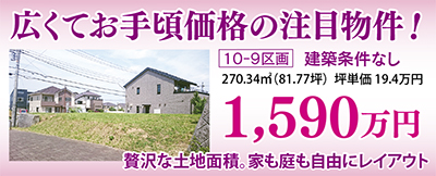 神奈川中央交通(株)不動産部が6月18日(土)と19日(日)、残り2区画を残すのみとなった湘南めぐみが丘の分譲地で「現地見学会」を開く。230平方メートル(約69坪)を超える敷地が魅力で価格は1590万円〜、建築条件もないという好条件だ。