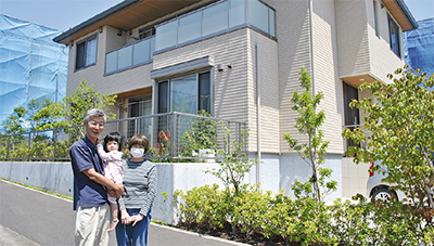 広いウッドデッキや3台分の駐車場、植栽を贅沢に確保しながら、二世帯住宅を建てたS邸。「うちもデッキの上で楽しみますが、庭でバーベキューをするご近所の姿をよく見かける。みんなニコニコ住みやすい環境ですよ」とSさんは笑う。