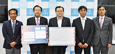 同社のご当地婚姻届はこれまでに全国35の自治体が採用。北海道苫小牧市は白鳥のカップル、島根県出雲市は出雲神話、山口県は福にかけた名産のフグをデザインするなど、ご当地の縁起物や文化を反映している。県内では平塚市が初の導入。七夕飾りや天の川などのイラストをあしらった。