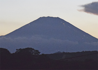 夏山シーズンのよく晴れた日の夕暮れから夜にかけ、「関東富士見百景」の金目川から富士山を望むと、山頂を目指す登山客や山小屋のライトが登山道に沿って点々と連なる様子を観測することができる。写真は頂上付近から右下へ稜線へ沿うように光が連なる。開山期間は9月10日まで。