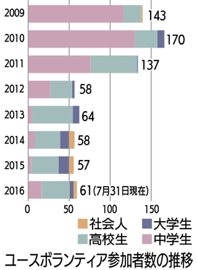夏休み中の学生らが市民団体の活動に参加するユースボランティア。その参加者数が2012年度を境に、激減している。その背景には、県公立高校入試でボランティアなどの活動実績を内申加点する制度が廃止された影響があるとみられる。