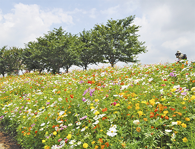 コスモスやフレンチマリーゴールド、ペチュニア、千日紅などの色とりどりの草花が、野生に近い形で植栽されている。カメラを持参して訪れていた近隣に住む女性は「カラフルで、とても華やか。写真を撮るのは難しいですが、素敵です」と、風に揺れる草花に目を細めていた。
