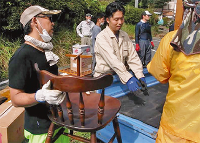メンバーはジャージや作業着姿で他のボランティアと合流し、倒壊の危険がある建物から家財道具を運び出す作業に従事した。復興の過程で家屋を取り壊す際も屋内を空にする必要があり、こうしたボランティアが今も現地では求められているという。