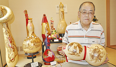 植原さんがひょうたんアートを始めたのは10年ほど前。テレビ番組で紹介されていたのを偶然見つけたのがきっかけだ。電気で熱したペン型のコテを使い、表面を焦がして図柄を描いていく。植原さんは「ひょうたんは時間が経つと茶色く変色してしまう。綺麗に保存するために絵付けを始めたら凝ってしまった」と目を細める。