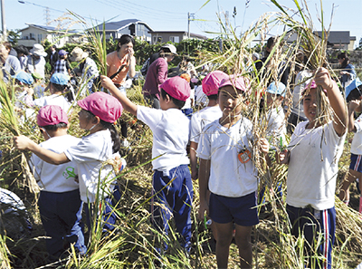 同園はイベントが盛りだくさん。10月26日には、2歳〜5歳の園児ら約120人が、同園保有の田んぼで稲刈りを楽しんだ。