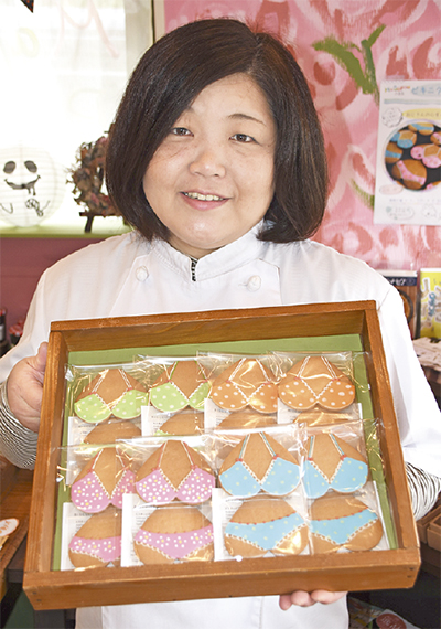 こんがり日焼けした肌に、レース付きのビキニをまとった姿が焼き菓子に――。焼き菓子専門店「マ・コピーヌ」(西八幡)が先月20日、東京都中央区で開催された「第5回全国逸品セレクション」に同店人気の「ビキニクッキー」を出品、フード部門で準グランプリを受賞した。同セレクションには全国から9団体17作品が参戦。各店舗は自慢の”逸品”を競い合った。