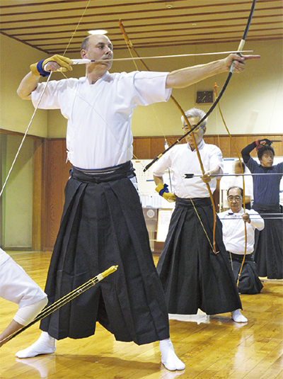 ウォルフさんが目指すのは、競技として矢を的に中てることだけでなく、武道として弓を射る技術や、作法の品位、風格など美しさを表現することだ。日本語もおぼつかない状態だったが、協会には英語を話せる会員もおり、ウォルフさんをサポートした。193cmの長身に合う袴がなかなか見つからず、少しだけ裾が短いのもご愛嬌。「素晴らしい先生や、会員の皆さんがいなければ続けられなかった。やればやるほど奥が深く、帰国したとしても、生涯続けていきたい」と初段合格を喜ぶ。