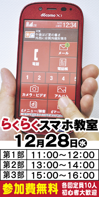 12月28日(水)に開催されるのが「らくらくスマホ教室」。講師はスマホを知り尽くした富士通のプロ講師が務め、専門用語を避けながら丁寧に教えてくれる。