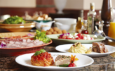 パスタは3種類から、メインは魚・肉どちらかを選択。前菜とデザート、ドリンクなど計30種類はビュッフェ形式で楽しめる。