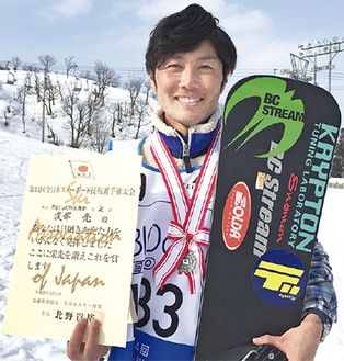 第14回全日本スノーボード技術選手権大会(新潟県南魚沼市・3月2日〜5日)のアルペン男子部門に出場した平塚市役所スキー部所属の渡部亮さん(37)=代官町在住=が、総合1598点で準優勝に輝いた。2年前に患ったガンとの闘病を乗り越え、自身初の表彰台にのぼりつめた。
