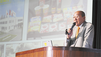 平塚江南高校で18日、味の素で26年間の海外駐在生活を経験、現地法人の社長などを務めた同校OBの酒井芳彦氏(現・海外職業訓練協会アドバイザー)が訪れ、母校の後輩たちに「世界に通じるグローバル人材」について講演した。卒業生の経験を生徒の教育に役立てる「助っ人バンク」を通じ、江南同窓会(真壁佐一会長)が3年生対象のキャリア講座に招いた。