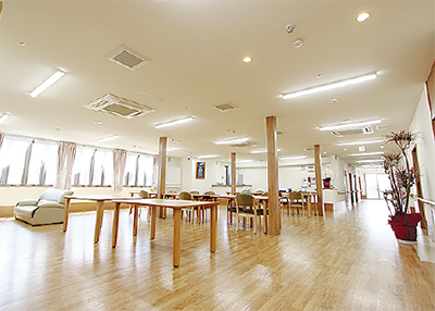 施設近くには松延小学校が立地し、閑静な住宅地に囲まれる同苑。各階には広々とした共有スペースを擁し、食事や体操、レクリエーションなど、利用者は思い思いにゆったりと日々の生活を送っているようだ。