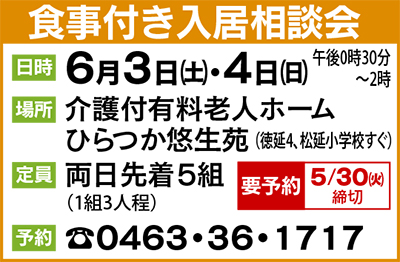 そんな疑問や要望を解消してもらおうと、(株)メディカルライフケアが運営する介護付有料老人ホーム「ひらつか悠生苑」(徳延)で6月3日(土)と4日(日)、「食事付き入居相談会」を開催する。開催時間は午後0時30分〜2時。両日先着5組(1組3人程)で要予約制。