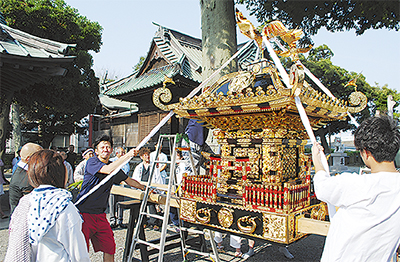 神輿保存会会長の臼井崇さん(41)も新調された大みこしを感慨深く見つめる。臼井さんは神社の歴史文化を後世につなごうと、会員増強に奔走、今では10〜20代のメンバーも増え保存会は若返った。「例大祭で大みこしの雄姿を多くの方に見てほしい。みこしをしっかり継承していく」と前を見据えている。