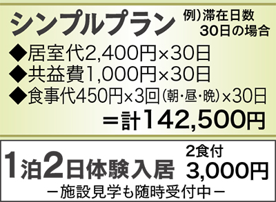 同住宅では、自立した入居者を想定した「シンプルプラン」を導入。安否確認や生活相談などの基本サービスにスマート化し、食事も回数に応じて負担額を設定する。清掃や洗濯といった追加サービスは、必要になった時にだけ依頼する。また家族の出張や希望施設の入所待ちなどのため、短期入居したい人は居室料も日割りで利用できる。