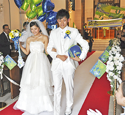この取り組みは、ウェディングプランナーなどを目指す同校の学生が本番さながらの挙式を企画するというもの。今年は湘南ベルマーレのスローガンである「共走」を夫婦の絆になぞらえ、ベルマーレ一色の挙式となった。