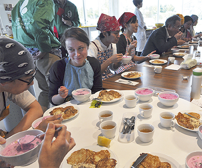 料理教室では、料理研究家で『旅するリトアニア』の著者でもある口尾麻美さんが講師となり、ピンク色の冷たいボルシチ「シャルティ・バルシチャイ」と、家庭料理として食べられているポテトパンケーキ「ブルヴュ・ブリーナイ」を調理した。