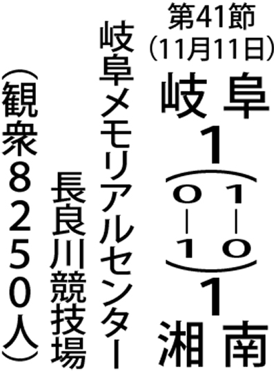 今季初の連敗かと思われた85分。右ショートコーナーから放った神谷のクロスから岡本が頭で狙い、こぼれ球を端戸が蹴り込んでゴール。副審は一時オフサイドの判定を下したが、湘南のゴールが認められ同点。 今季ホーム最終戦でサポーターに白星を届けたい岐阜は、アディショナルタイムでコーナーキックからの