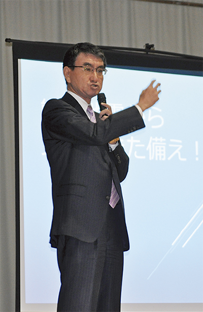 河野氏は、30年以内に70%の確率で発生するとされる首都直下型地震の被害想定で、死者が最悪で2万3千人、死因の7割が火災との予測を紹介。「(揺れを感知して通電を遮断する)感震ブレーカーで地震火災にかなり歯止めがかかる」と設置を呼びかけ、家具の固定や地震保険の加入などの備えを訴えていた。