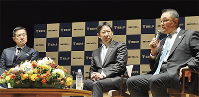 元水泳日本代表で、ソウル五輪で金メダルを獲得したスポーツ庁長官の鈴木大地氏を招き、体育学部客員教授の原辰徳氏、副学長の山下泰裕氏が座談した。第一線で活躍してきたそれぞれの半生を振り返りながら、2020年に向けたスポーツ振興を語った。