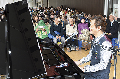 また同日には、市役所1階多目的スペースで市内在住のブラジル音楽ピアニストの今井亮太郎さんがミニコンサートを開催。「イパネマの娘」や市のプロモーション動画で使用される「セピア・ホーザ」など人気曲を披露し、駆けつけた市民は奏でる音色を聞き入った。