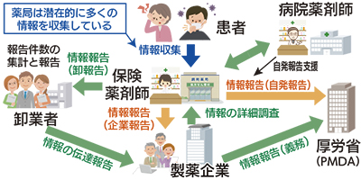 病院や薬局、製薬会社などの医療機関は、医薬品医療機器法で副作用に関する報告を厚生労働大臣にすることが義務付けられている。しかし実際は病院などからの報告が多くを占め、薬剤師の認識不足や提出書類が煩雑なこともあり薬局からの報告は少ない。