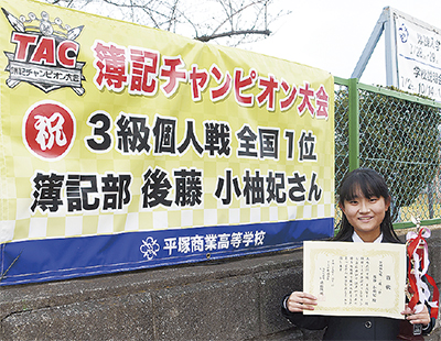 大会は「日商簿記検定」の模擬試験で公認会計士や税理士を目指す全国の大学生らが腕を競うもの。後藤さんは271人が参加した「日商簿記3級」の部に出場し、満点の成績で1位を獲得した。後藤さんは「簿記は高校で勉強を始めた。満点はうれしいし自信にもつながった」と振り返る。